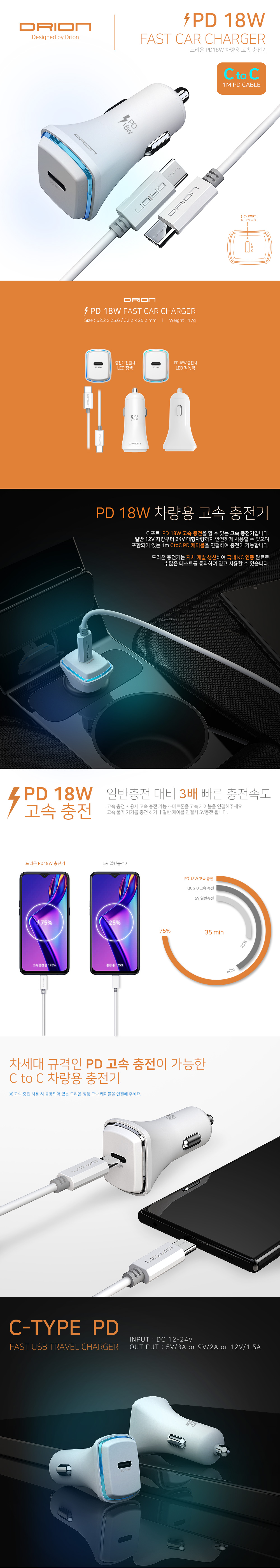 [µå¸®¿Â] PD 18W CtoC ±Þ¼Ó ºÐ¸®Çü Â÷·®¿ë ÃæÀü±â DR-C-PD-18W - PD C to C (5V 3A)